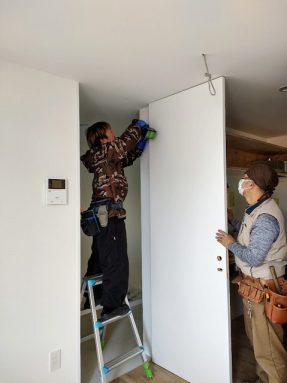 室内ドア設置。ドアハンドルがキッチン天板に干渉してる?