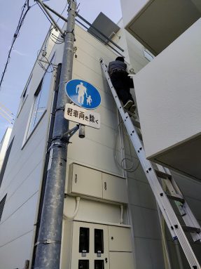エアコン設置。室内から外の配電盤と柱を避ける位置に穴開けするのに四苦八苦。