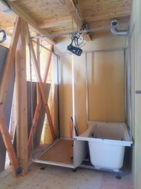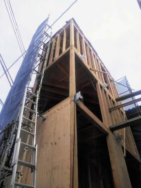 外部階段がまだ無いので、足場を使っての搬入荷揚げが超大変!これを見てるとUB代を値切ってはいけません。