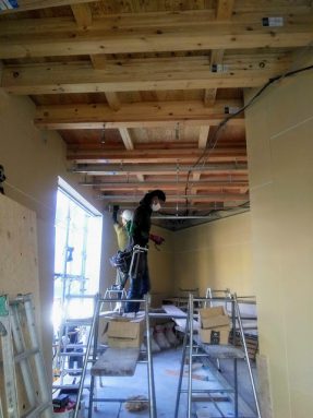 石膏ボードで壁を仕上げていきます。ここでも納まりの質問が(涙